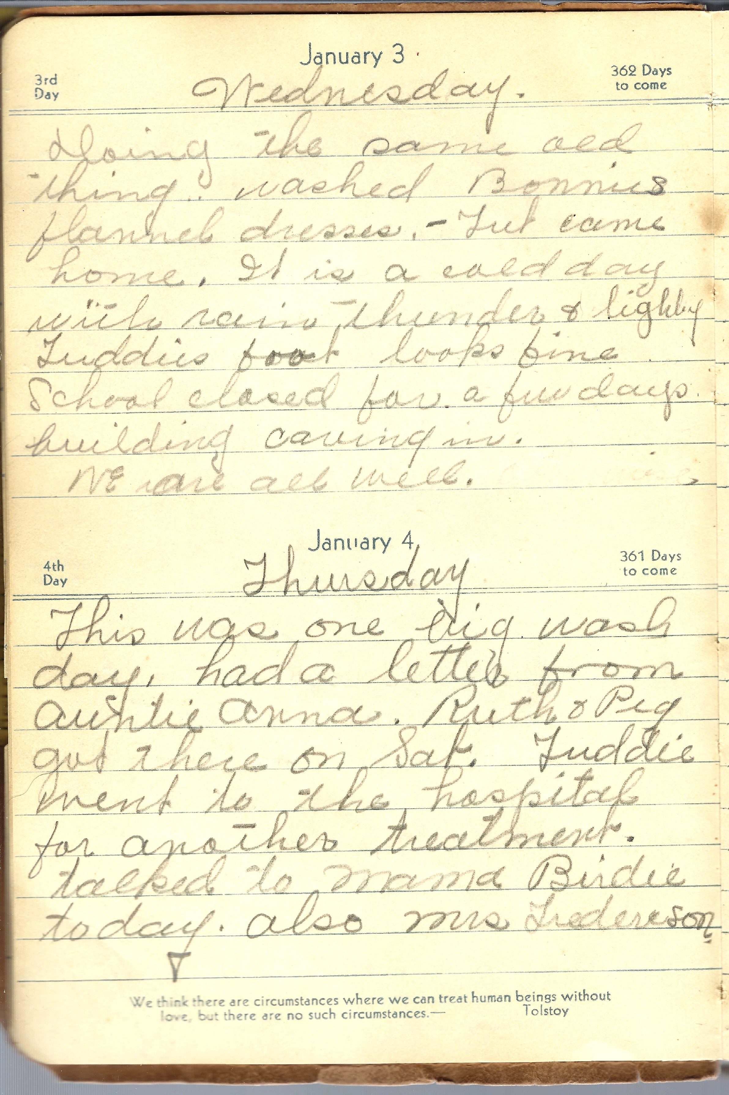 Doing the same old thing. Washed Bonnies flannel dresses. Tut came home. It is a cold day with rain thunder and lighting. Tuddies foot looks fine. School closed for a few days. building caving in. We are all well.