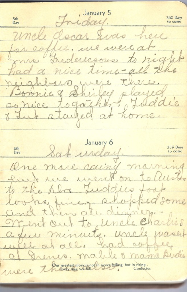 One more rainy morning but we went on to Austin to the Drs Tuddies foot looks fine. shopped some and then ate dinner. – Went out to Uncle Charlies a few minutes. Uncle wasn’t well at all. had coffee at Irenens. Mable and Mama Birdie were there also.