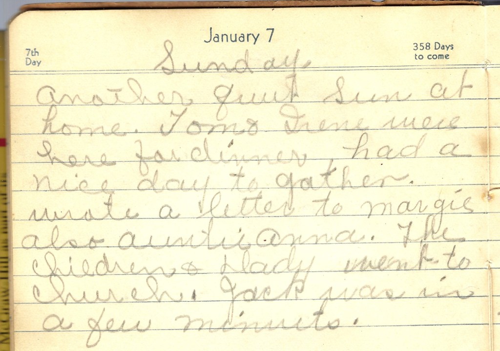 Another quiet Sun at home. Tom & Irene were here for dinner had a nice day to gather. wrote a letter to Margie also Auntie Anna. The children & Dady went to church. Jack was in a few minutes.