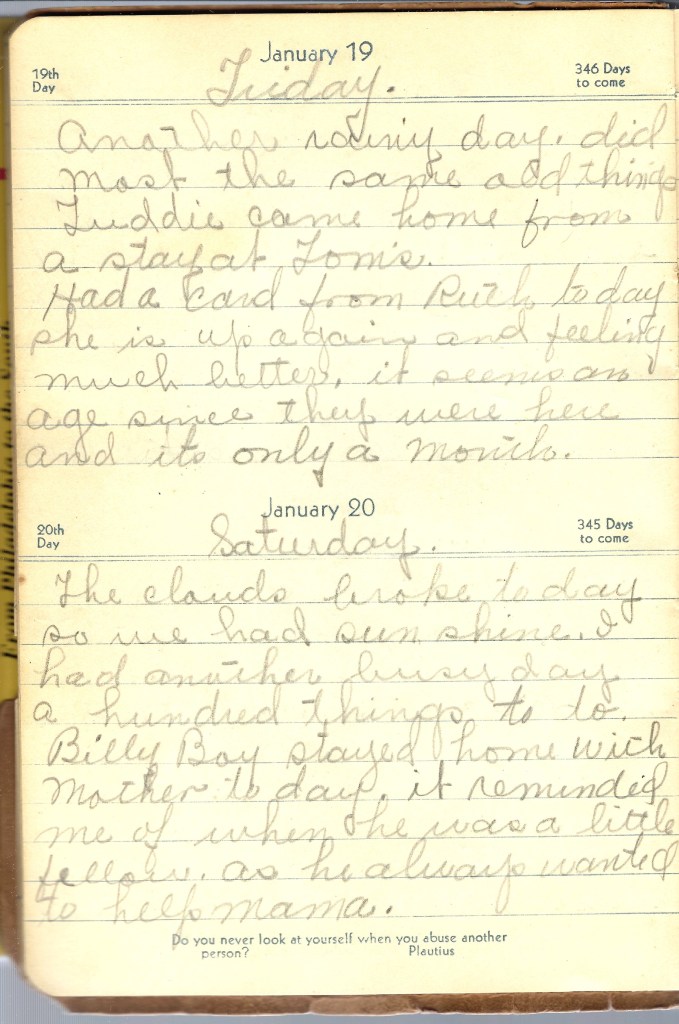 Another busy day. I baked cut Bonnie a dress by her new pattern – wrote a letter to Aunt Ruth. – we had some more rain today and its colder. this has been a record day for Bonnie Jane, she forgot to cry. We are all well.