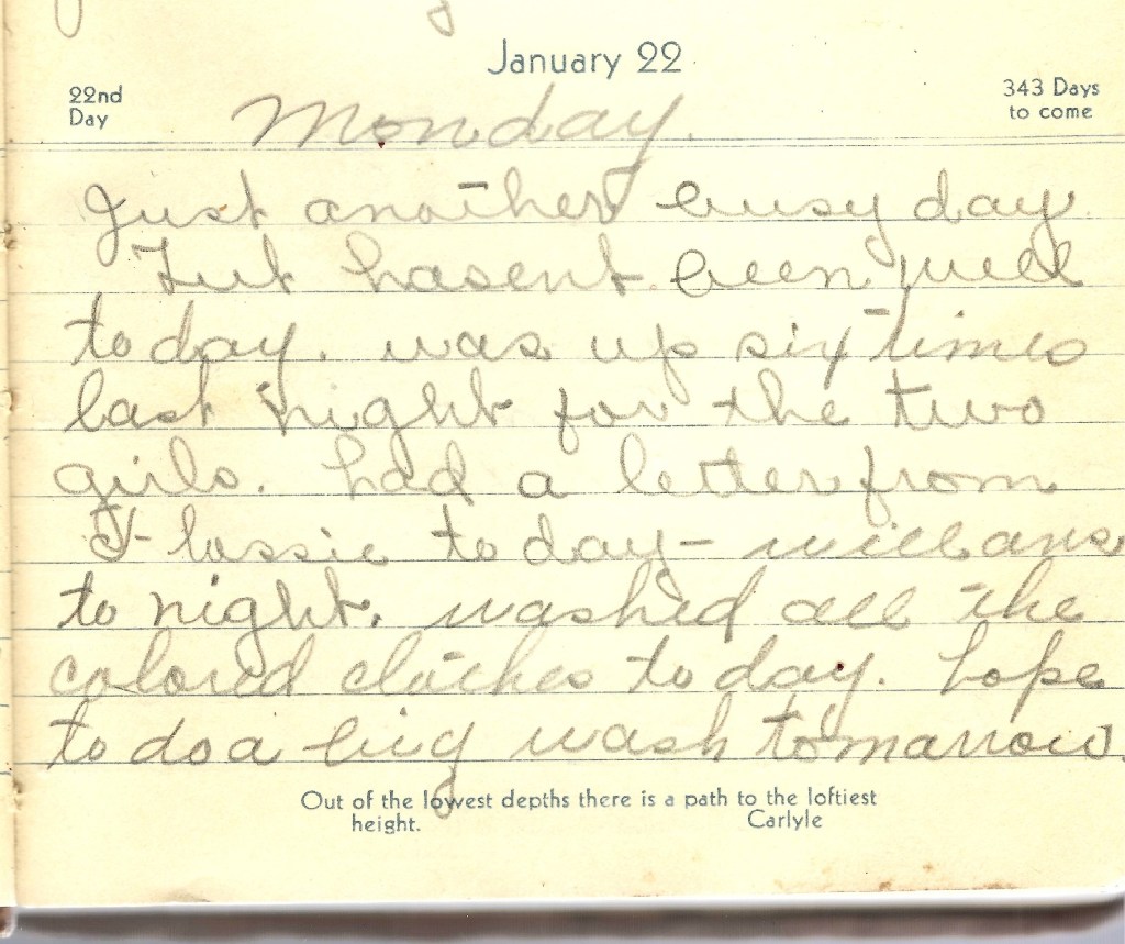 Just another busy day. Tut hasent been well today. was up six times last night for the two girls. had a letter from Flossie today – will answer tonight. washed all the colored clothes today. hope to do a big wash tomorrow.