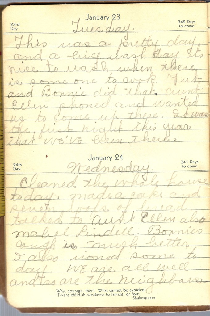 Cleaned the whole house today. made a cake and seven loofs of bread. talked to Aunt Ellen also Mabel Lindell. Bonnies cough is much better I also ironed some to day. We are all well and so are the neighbors.