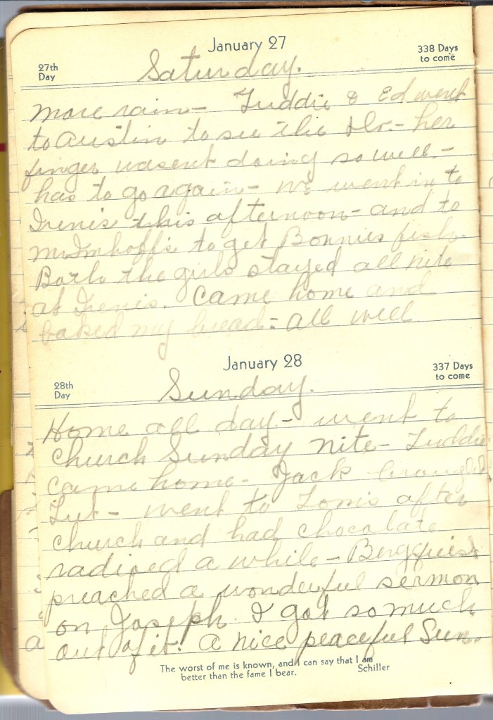 Home all day. – went to church Sunday nite – Tuddie came home. Jack brought Tut – went to Tom’s after church and had chocolate radioed a while – Bergquist preached a wonderful sermon on Joseph. I got so much out of it. A nice peaceful Sun.