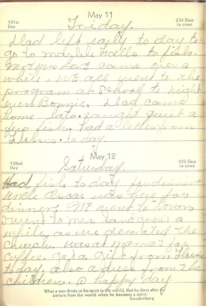 Had fish to day for dinner Uncle Oscar was here for dinner. We went to town I went to Mrs. Sandgren’s a while as we decorated the church. was at Mama’s for coffee. Got a gift from Flossie to day. also a dress from the children. A happy day.