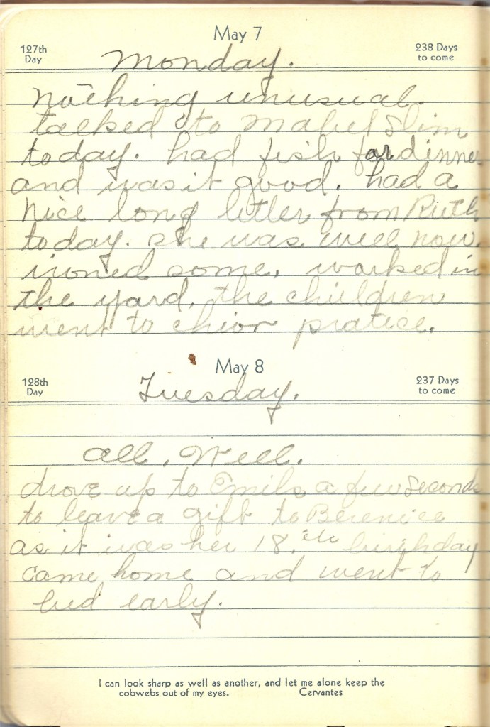 “I was told a sweet little secret today.” — Pretty sure the secret is that Mabel is expecting. Franklin is born in December 1934, and I couldn’t find another kiddo in the clan that was born this year.