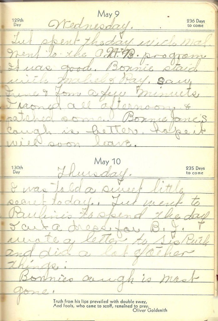 I was told a sweet little secret today. Tut went to Pauline’s to spend the day I cut a dress for B.J. wrote a letter to Sis Ruth and did a lot of other things.