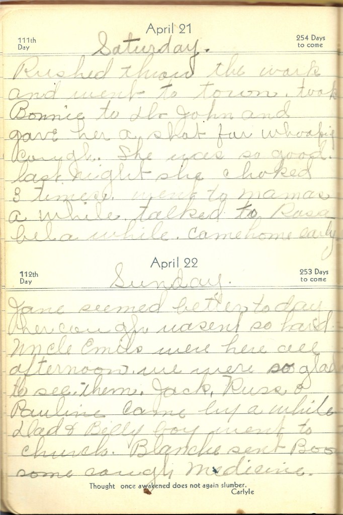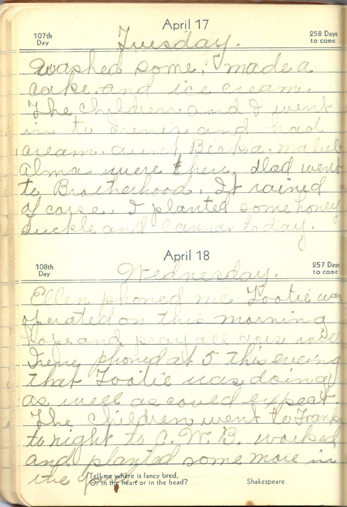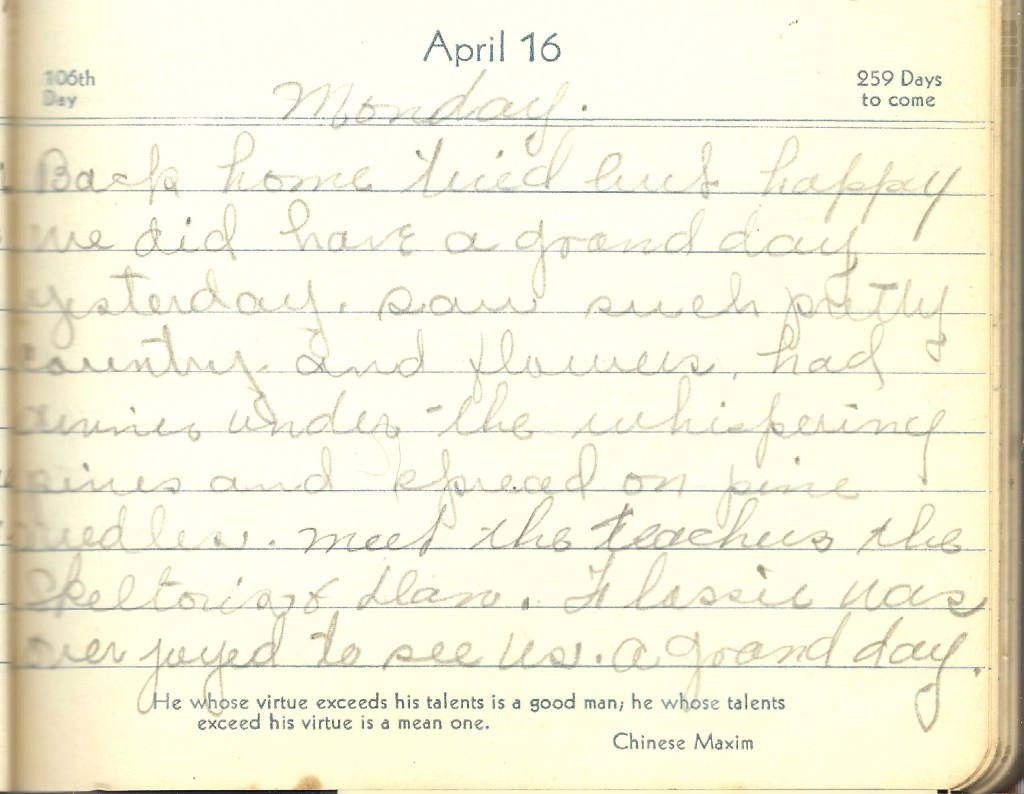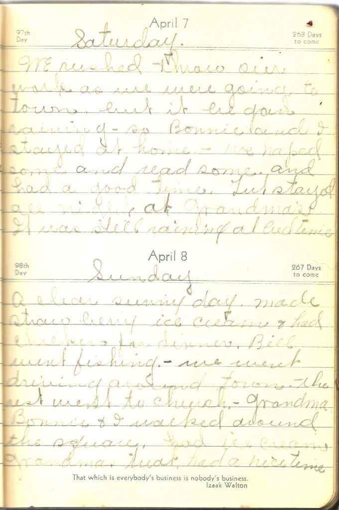 Nothing unusual. talked to Mabel Slim today. had fish for dinner and was it good. had a nice long letter from Ruth today. she was well now. ironed some. washed in the yard. the children went to choir practice.