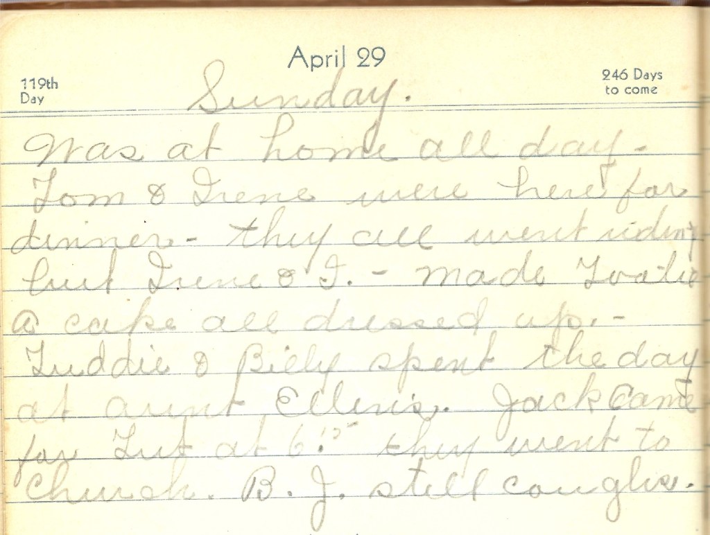 I was told a sweet little secret today. Tut went to Pauline’s to spend the day I cut a dress for B.J. wrote a letter to Sis Ruth and did a lot of other things.
