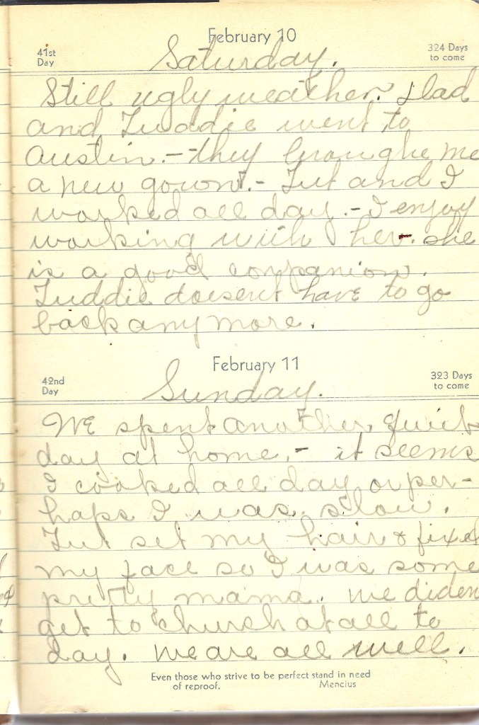 Still ugly weather. Dad and Tuddie went to Austin. – they brought me a new gown. – Tut and I worked all day. – I enjoy working with her. she is a good companion. Tuddie doesn’t have to go back anymore.