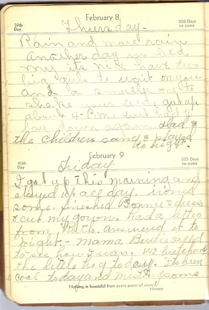 I got up this morning and stayed up all day. ironed some. finished Bonnie’s dress & cut my gown. had a letter from Ruth. answered it tonight.- Mama Birdie called to see how I was. We butchered the little hog today. Its been cool today and misting some.