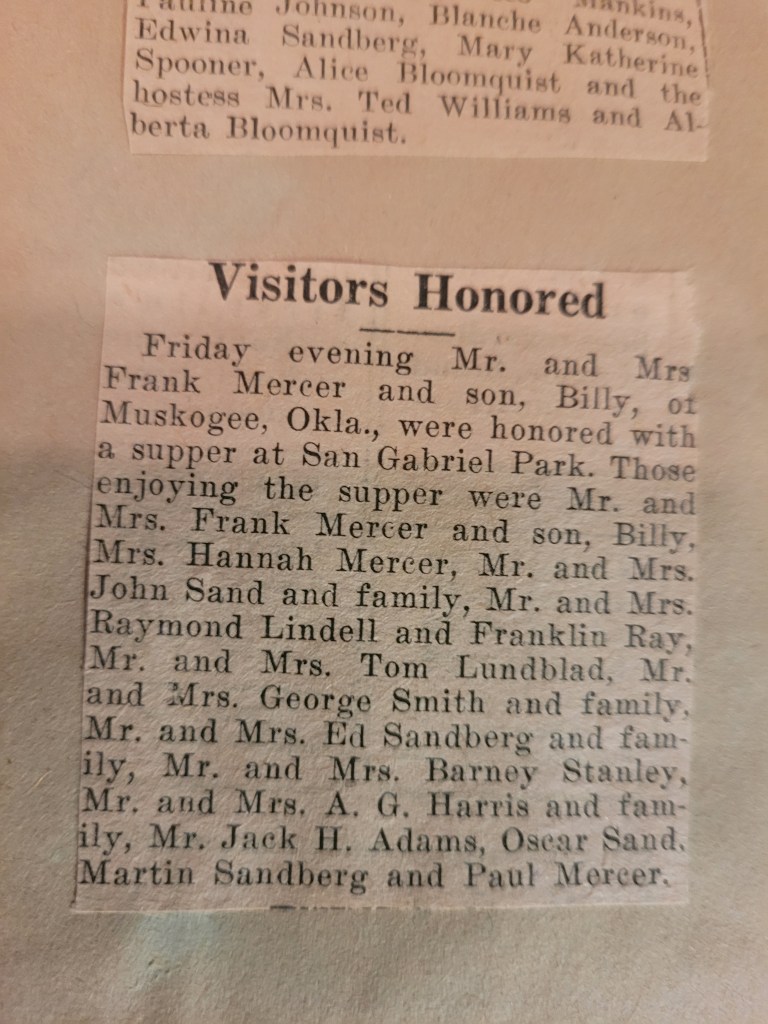 The scrapbook is from the 1930s, ending in 1938, just before my grandparents get married (my grandpa is “Mr. Jack H. Adams” and my grandma is included in “Mr. and Mrs. Ed Sandberg and family”). “Mr. and Mrs. Frank Mercer and son Billy” are Bill and his parents. All the others are Sandberg and Mercer kin of various generations. It’s always fun to see these little mentions in the local newspaper.