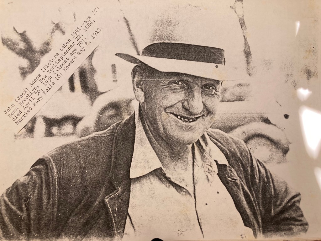 In another note on the same picture in another of my great Uncle Earl’s (Earl Kenneth Adams 1918-1999) genealogy books that he self published in 1989, it says, “Jack (John) Adams (September 22, 1884–April 28, 1954) Picture taken July 1941. Parents were Frank Adams and Helen (Rogers) Adams. Born Brooklyn. New York. Had a full sister named Mary. His dad married twice. Five or six half-sisters.”