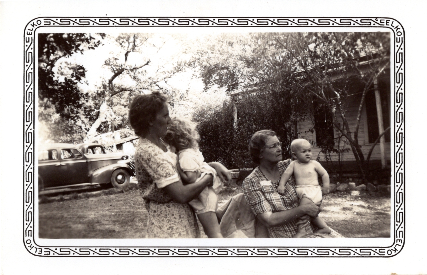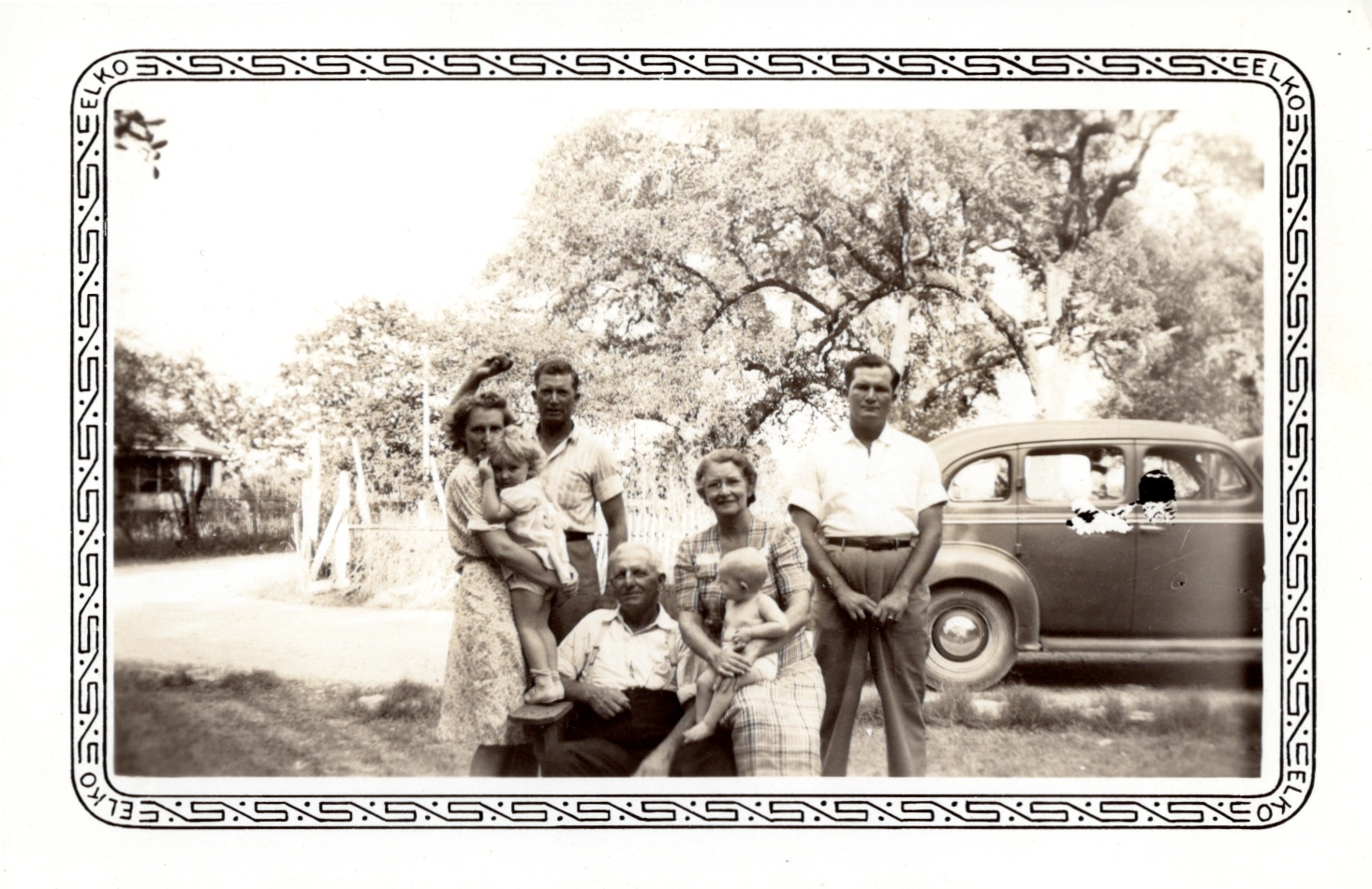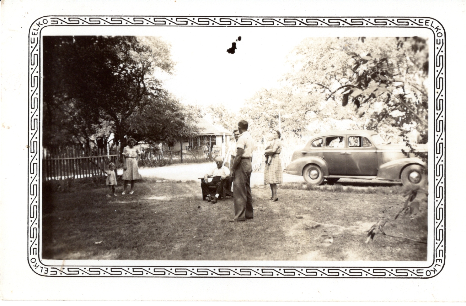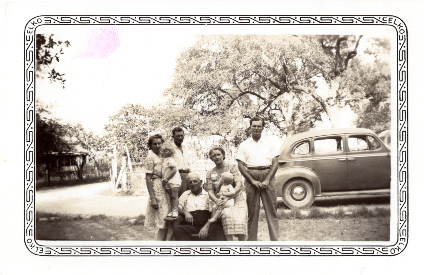 This series of photos is from the Old Home Place, around 1942, judging from how old Aunt Billye is. She’s the tiny one in diapers. And the toddler is my mama, Kay. The older couple are my great grandparents, Jack and Mary (Howard) Adams, The younger couple are Jack Howard and Tut (Edwina Sandberg) Adams, parents of Kay and Billye. The two other men are Jack and Mary’s sons Elzah (in the white shirt) and Earl (in the long sleeve shirt) Adams. I love this series of pics, starting with the random group shot of everyone not yet organized. I can’t imagine trying to wrangle this group. Maybe this was Easter? It was early in the war anyway, before the three boys got sent off in various directions. You can see the curb stones in many of the shots, particularly the ones of Tut and Mary and the little girls, but also lining the driveway behind them and along the flower beds.