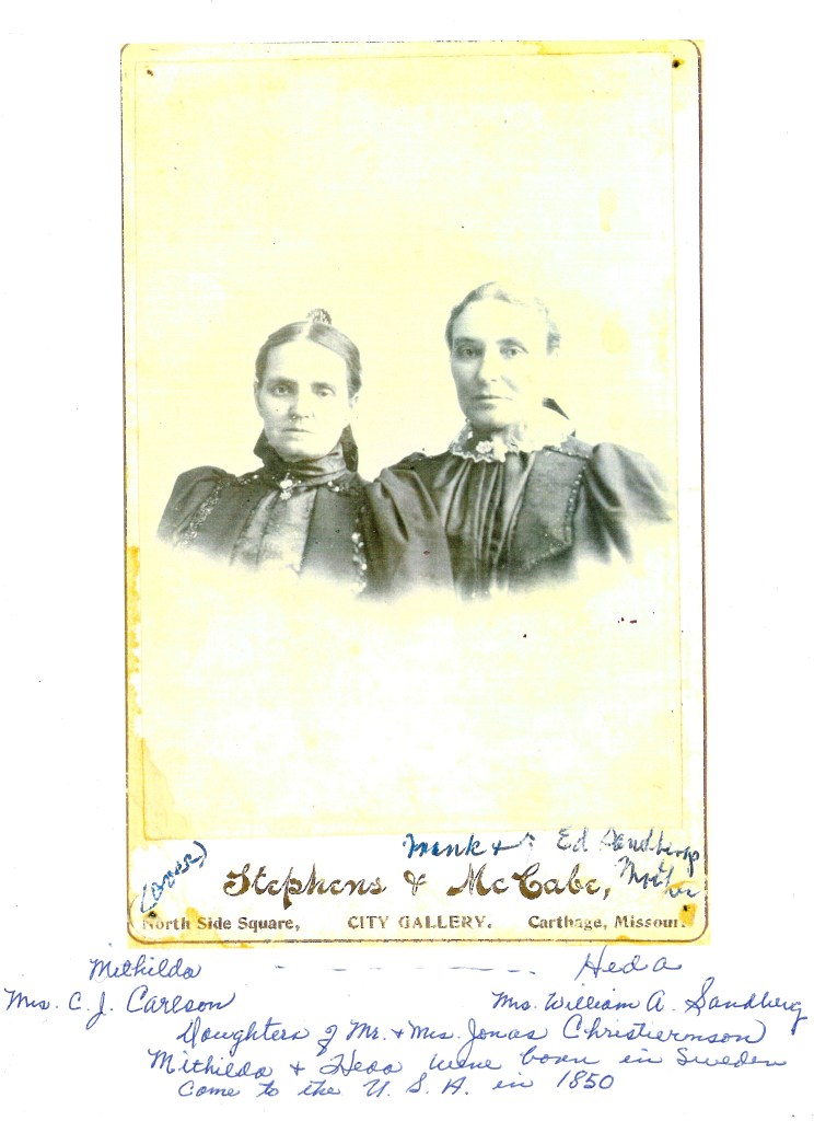 The notation for the woman on the left, though, is a little garbled. Hedda had three sisters, Anna Lena, Mathilda, and Adla Suzanna. She also had a brother Sven August. The four older children are listed in the ship record above. Adla Suzanna was born 21 June 1859, after they had been in America for about 5 years. And Maya Lena was 47 when she was born! The notation says that this is Mithilda (spelled wrong all three times) and that she is Mrs C. J. Carlson. I am pretty certain that this is not Mathilda, because she died in 1870 at the age of 18, when Hedda would have been about 25. Neither of these women are that young.