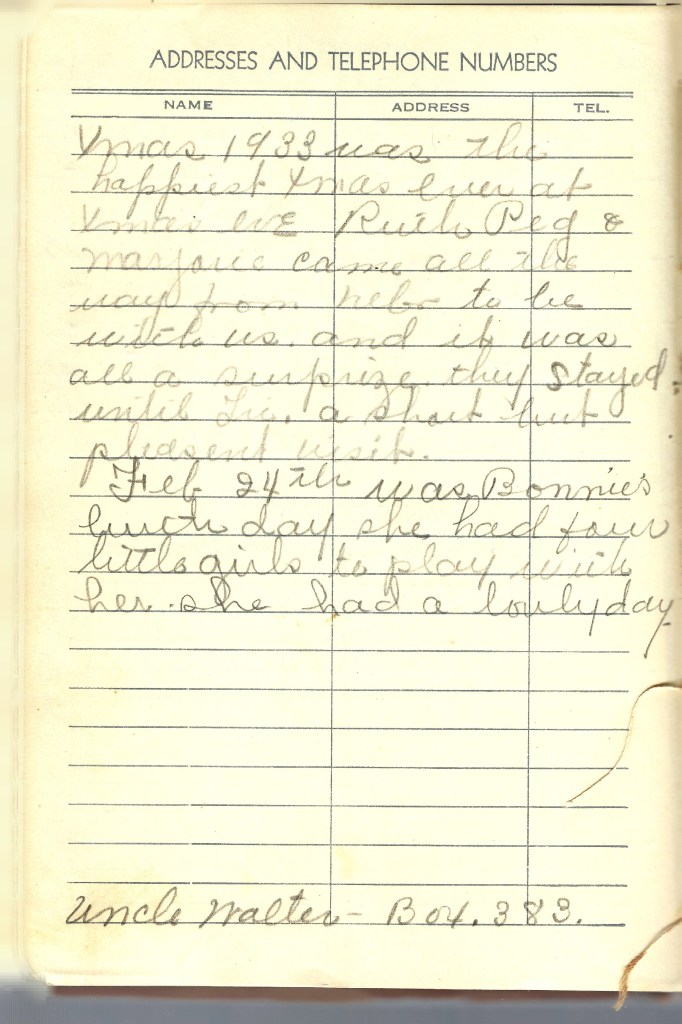 Xmas 1933 was the happiest Xmas ever at Xmas eve Ruth Peg and Marjorie came all the way from Nebr to be with us. and it was all a surprise. they stayed until Fri. a short but pleasant visit.